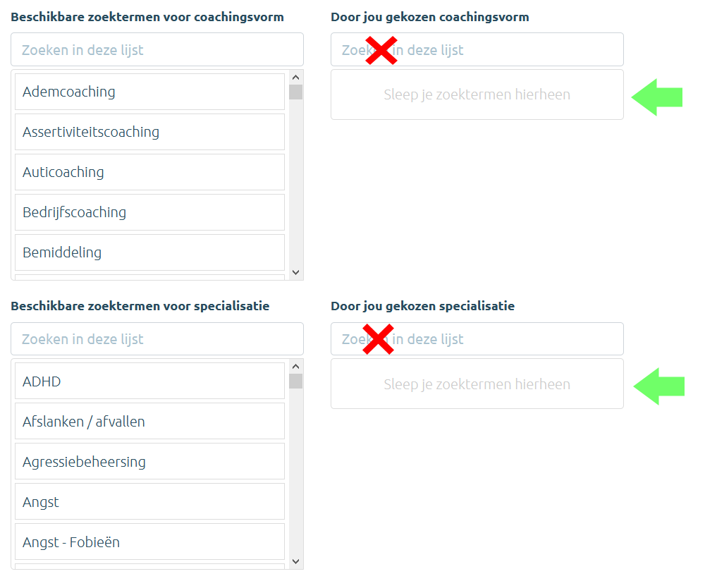 - Vind je jezelf niet terug onder een bepaalde zoekterm? Kijk dan na of je die term wel zeker geselecteerd hebt. Je bent énkel vindbaar op de termen die geselecteerd staan op jouw profiel.